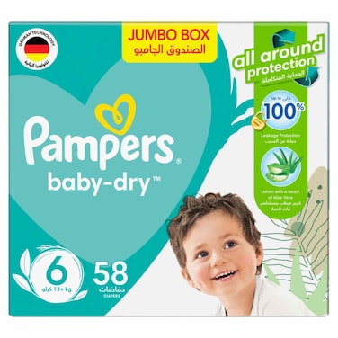 - <ul><li>راحة وملاءمة أفضل: تأتي حفاضات بامبرز مقاس 6 بجوانب أكبر وأوسع مصممة حديثًا لتوفير راحة أفضل لطفلك في أي وقت من اليوم. إنها تسمح لطفلك بالتحرك بحرية من خلال توفير ملاءمة مثالية مع الحفاظ على جفاف بشرته<li/><li>وداعاً للطفح الجلدي مع لوشن الألوفيرا: نسيج حفاضات بامبرز بيبي دراي ذات الشريط اللاصق مليء بلوشن الألوفيرا ليساهم في حماية بشرة طفلك الناعمة من الطفح الجلدي بترطيبها جيدًا والحفاظ على جفافها تمامًا<li/><li>احتفظي بعبوة اقتصادية في متناول يديك من بامبرز مقاس 6 لتجنب إصابة بشرة طفلك بطفح جلدي في أي وقت خلال اليوما<li/><li>حماية شاملة من البلل للحفاظ على جفاف البشرة وصحتها: تتميز حفاضات بامبرز بيبي دراي المزودة بشريط لاصق بثلاث قنوات امتصاص تعمل على توزيع البلل بالتساوي وتحبسه بشكل أفضل باستخدام الحفاض بالكامل من الأمام إلى الخلف لحماية من التسرب بنسبة تصل إلى 100% والحفاظ على الجفاف لأكثر من 12 ساعة<li/><li>الحماية المميزة من التسرب: صُممت الحفاضات مميزة الامتصاص لحماية طفلك لأكثر من 12 ساعة من خلال توفير حماية مميزة من التسرب. إنها مريحة وآمنة للارتداء لساعات طويلة وستحافظ على جفاف مؤخرة طفلك وتساعد على منع الإصابة بطفح الحفاضات<li/><li>موانع التسرب المزدوجة: صُممت منتجات بامبرز للأطفال لضمان الحماية الشاملة لطفلك طوال اليوم. صُممت الأساور المحسنة والواقية على جانبي هذه الحفاضات لاحتواء السوائل بشكل أفضل. تلتف هذه الحواجز المزدوجة المانعة للتسرب بشكل مريح حول ساقي طفلك لحجز الفضلات<li/> </ul>