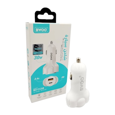 شاحن سيارة بمنفذ يو اس بي ومنفذ نوع سي بي دي ، 30 واط/DC-12-24V/2.4A للسيارة- ابيض BO- الطاقة المنتجة