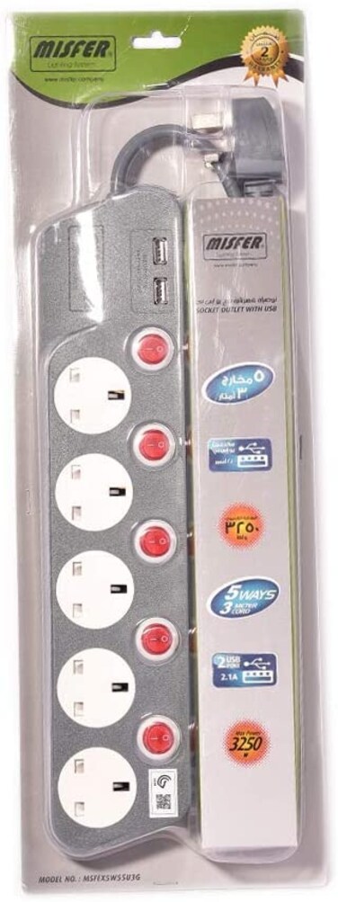 توصيلة كهربائية 5 افياش مع يو اس بي 3 متر لون رمادي