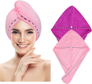 عبوة من قطعتين من منشفة تجفيف الشعر، قبعة تجفيف للشعر من المايكروفايبر سريعة الامتصاص مع حلقة مرنة وزر للاغلاق، منشفة الشعر الملفوفة لتجفيف سريع للشعر الرطب للنساء (بينك واحمر وردي)