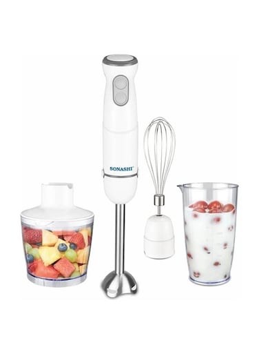 سوناشي طقم خلاط يدوي 4 في 1 مع مفرمة ودورق معاير وخفاقة، سعة 600 مل، 400 واط، SHB-184JCW، أبيض