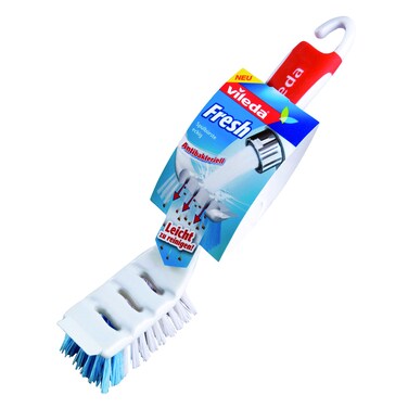 Cleaning brush with square tip and integrated scraper. Ergonomic soft grip handle. Silver Ion antimicrobial action neutilizes germs to prevent them from growing and put a stop to bad odours. Ideal for washing dishes and sinks.