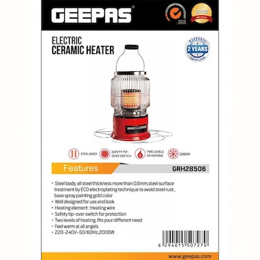 - رقم الطراز GRH28506 •قوة 2000 واط •مستويين للتسخين •مفتاح أمان إضافي •جسم فولاذي •التردد 60/50 هرتز •ضمان 2 سنة شامل