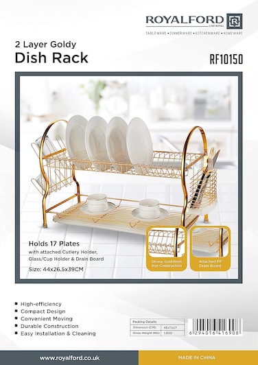 حامل تجفيف اطباق بتصميم انيق مصنوع من حديد متين وعالي الجودة من طبقتين مُرفق بـلوح تصريف من البولي بروبلين مع حامل يتسع لـ 17 قطعة اكواب واوعية زُجاجية للمطبخ - ذهبي - RF10150