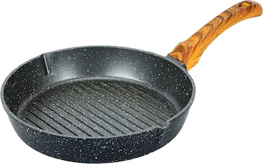 مقلاة شواء مستديرة غير لاصقة من الالومنيوم المصبوب مطلية بالجرانيت ومزودة بفوهتين للصب بمقبض باكيليت بلمسة نهائية من الخشب القوي من رويالفورد، متعددة الالوان، مقاس 24 سم سمك 4 ملم، موديل RF10765