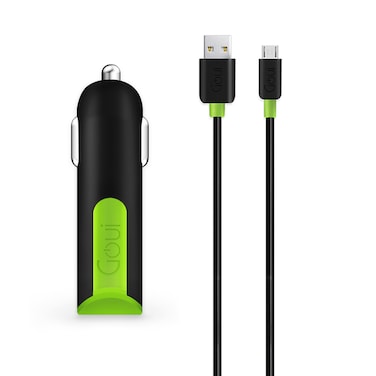 قوي شاحن سيارة 2 يو اس بي + كابل مايكرو ، أسود / اخضر