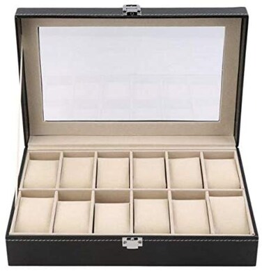 صندوق تخزين لمجموعة الساعات والمجوهرات 12 شبكة حافظة عرض للساعات مصنوعة من جلد البولي يوريثين صندوق منظم مزود بقفل