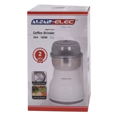 Alsaif Elec S64 Coffee Grinder is Made of a plastic base with stainless steel blades and cup. It is Rust-proof and transparent cover allows you to see without having to remove the cover. The cup has a capacity of 60 grams, and it contains a button for protection and safety. It is Perfect for grinding coffee, spices, nuts and whole grains, It has sharp blades that ensure a very satisfactory performance.
