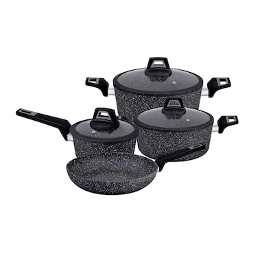 تصميم متين للغاية، يتميز طقم أواني الطهي بمقابض باردة الملمس ومريحة. هذه المقابض مثبتة بإحكام على الهيكل. مقبض الغطاء آمن للمس. الخامة متينة ومناسبة للأداء طويل الأمد. طقم أواني طهي رويال فورد الأنيق والعصري، 7 قطع، مصنوع من الألومنيوم المطروق الذكي، مع طلاء رخامي متين.