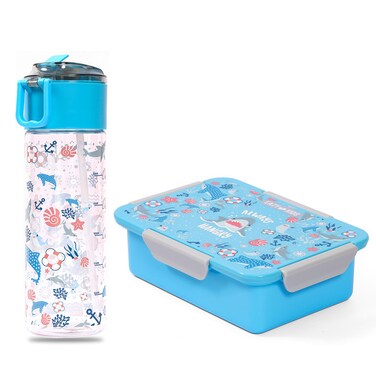 علبة غداء إيزي كيدز وزجاجة مياه تريتان مع علبة وجبات خفيفة، سمك القرش - أزرق، 450 مل