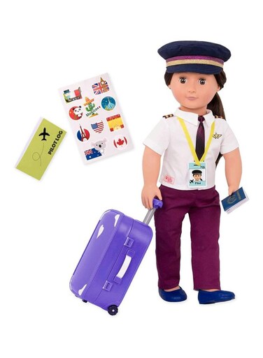 دمية جميلة بعيون بلون بني داكن وشعر بني طويل يتميز بتموجات وترتدي زي طيار