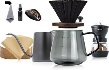 مجموعة تحضير القهوة بطريقة V60 بكج من 7 قطع مطحنة قهوة , سيرفر زجاجي,ابريق تقطير وترشيح, فلاتر قهوة وقمع تقطير سيراميك , وصينية وزن حبوب القهوة