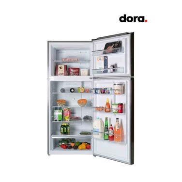 Dora DRAMS400 top mount refrigerator the perfect addition to any modern kitchen, with a sleek design and a spacious storage capacity, this refrigerator is suitable for medium to large families. It features an inverter system, multi air flow cooling system, and a total no frost system, which ensures that your food stays fresh and crisp for longer, the Dora refrigerator also has a humidity control crisper, which helps to maintain the ideal level of moisture in your fruits and vegetables, additionally the interior of the fridge is illuminated by led lights, which makes it easy to find what you're looking for.