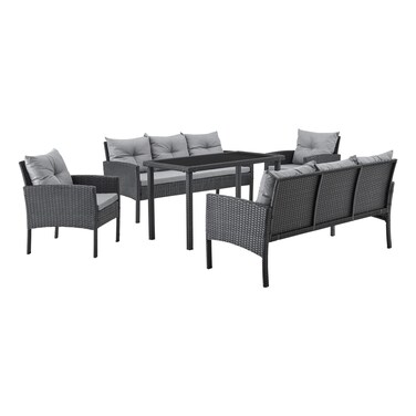 تحتوي على أريكة وكرسيين بذراعين وطاولة الطعام، مما يوفر مساحة واسعة لعائلتك وضيوفك. مادة الخوص متينة ومقاومة للعوامل الجوية، مما يجعلها مثالية للإستخدام في الهواء الطلق.