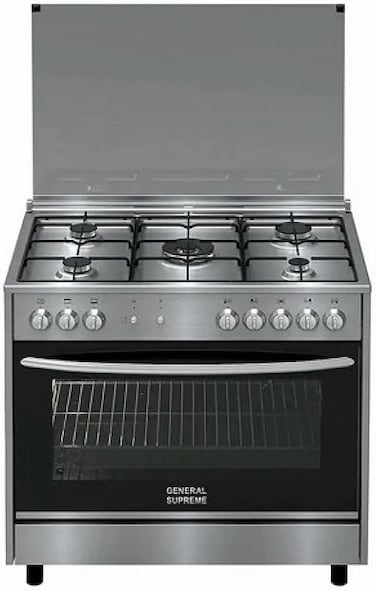 بوتاجاز غاز من الستانلس ستيل، 5 شعلة من جنرال سوبريم مميز بشعلة كبيرة بثلاثة صمامات في المنتصف. مميز بشعلات مصنوعة من الألومنيوم مع أغطية معدنية لامعة. مزود بقواعد لأواني الطهي من الحديد مطلية بالمينا. باب فرن مزدوج من الزجاج مع حواف زجاجية بلون أسود. يأتي بسعة 142 لتر.