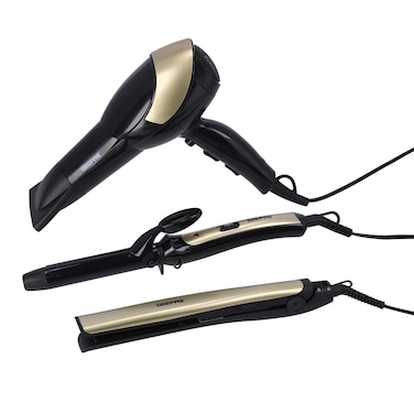 Geepas مجموعة تصفيف الشعر 3 في 1 من جيباس 2200 واط - سرعتان و 3 أجهزة تجعيد الشعر، مملس الشعر بألواح مطلية بالسيراميك مع مموج الشعر 25 مم، هدية مثالية للسيدات، مثالي للشعر القصير والطويل