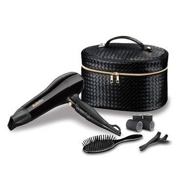 Babyliss 5721PE Hair Dryer Set consists of a light hair dryer that fits comfortably in your hand, an oval hairbrush with massage cushion, 4 self-adhesive rollers for extra volume and 2 hair clips to make styling easier. The beauty case has a woven leather look and is spacious enough to store all your accessories. It Eliminates static electricity for a smooth, shiny and no-frizzy result. Its Ergonomic handle provides a safe and comfortable grip for precise operation. It has 3 temperature and 2 speed settings allow breakage-free operation and silky hair finish.