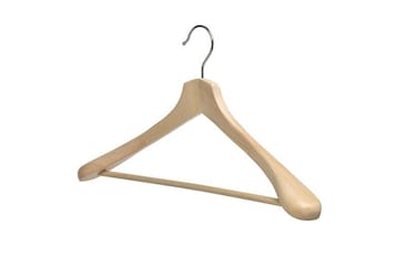 Hanger in solid wood which is perfectly shaped for coats, jackets, shirts and trousers.