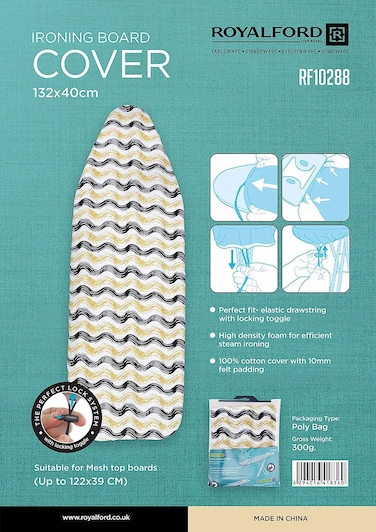غطاء لطاولة الكي، 132 × 40 سم، RF10288 - غطاء قطني متين مقاوم للحرارة مع حشوة من اللباد 10 ملم لحجم كبير وتصميم قابل للطي وأقدام غير قابلة للانزلاق