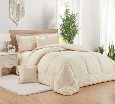 تعتبر التفاصيل الرائعة والزينة والمظهر الحريري مثالية للمناسبات الخاصة لإثارة إعجاب ضيوفك وتقديم فكرة إهداء رائعة. طقم لحاف رومانسي للغاية ومكشكش ومزين بالحرير يوفر مجموعة كاملة من 6 قطع من مستلزمات الفراش! ستضفي هذه المجموعة تحولًا كاملاً على غرفة نومك وتغير جو الغرفة بالكامل.