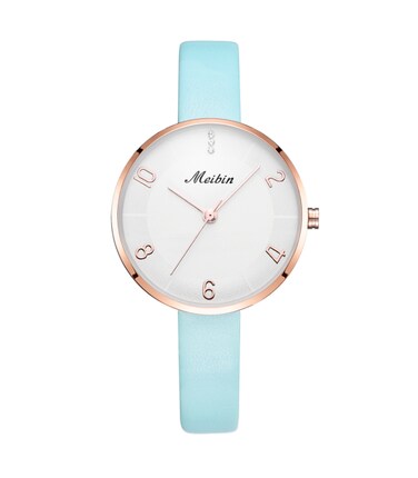 العلامة التجارية: ميبين, لون المينا: ابيض, لون الهيكل: روز جولد, لون السوار: ازرق سماوي, نوع العرض: انالوج, شكل الساعة: دائري, مادة السوار: جلد, رقم الموديل: M1188-BLRG