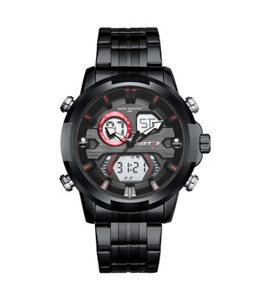 العلامة التجارية: ريستوس, لون المينا: اسود و احمر, لون الهيكل: اسود, لون السوار: اسود, نوع العرض: انالوج - ديجيتال, شكل الساعة: دائري, مادة السوار: ستانلس ستيل, رقم الموديل: 9359-BR