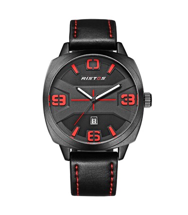 العلامة التجارية: ريستوس, لون المينا: متعدد الألوان, لون الهيكل: اسود, لون السوار: اسود و احمر, نوع العرض: انالوج, شكل الساعة: وسادي, مادة السوار: جلد, رقم الموديل: 9333-R