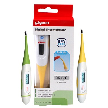 Pigeon Digital Thermometer measures temperatures accurately, up to 2 decimal points. Featuring safe and flexible soft tips with beeper, memory and fever alarm. Auto-off feature to save battery when not in use.