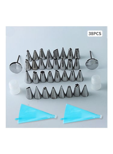 طقم أدوات تزيين الكيك مكون من 38 قطعة مع 32 قطعة من أطراف التزيين/أكياس معجنات/2-أظافر زهور/2 طقم أدوات تزيين بلاستيكية قابلة لإعادة الاستخدام فضي 19.5*4*13سم