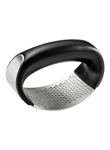 مبشرة ثوم صغيرة مصنوعة من الإستانلس ستيل مزودة بمقبض أسود/ فضي