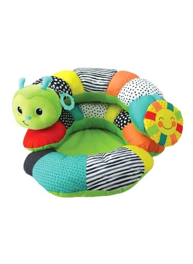 قم بتمديد هذه اليرقة المرحة للسماح لطفلك بالنوم على بطنه، هذا ما يساعد الطفل على تقوية عضلات الرقبة والظهر أثناء اللعب بالدمى ناعمة الملمس والعضاضة الخالية من مادة بيسفينول A والشمس التي تصدر صوت خشخشة