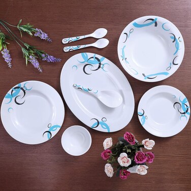 10" Dinner Plate 6pcs8" Deep plate 6pcs10" Bowl 1pc4.5" Bowl 6pcs14" Oval plate 1pcsoup spoon 6pcsRice spoon 1pcقابلة للاستخدام في غسالة الصحون : yes : رويال فوردالمادة : ميلاميناللون : ابيضقابلة للاستخدام في المايكرويف : نعمنوع : طقم اواني الطعام