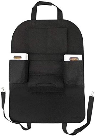 حامل مزود بجيوب للتخزين يوضع امام مقعد السيارة الخلفي لتنظيم وتخزين الاغراض كالقوارير وعلب المناديل والالعاب، لون اسود، قطعة واحدة
