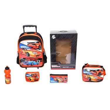 طقم حقيبة مدرسية بعجلات5in1، مزينة برسوم سيارات (فاست آند ذا فيوريوس) 18 بوصة