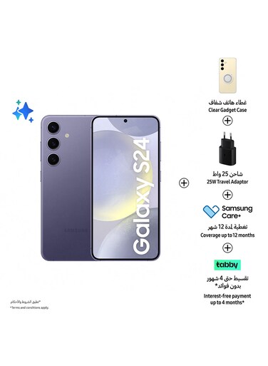 سامسونج جالكسي S24، ثنائي الشريحة، 8 جيجابايت رام، 256 جيجابايت، شبكة الجيل الخامس، بنفسجي كوبالت - إصدار الشرق الأوسط مع غطاء شفاف، شاحن سفر 25 واط و سامسونج كير+