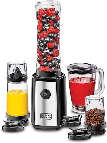 خلاط شخصي رياضي/صانع عصائر صغير الحجم من بلاك +ديكر 300 واط 16 قطعة 4 في 1 مع عصارة الحمضيات ومطحنة، فضي/ اسود - SBX300BCG-B5، مضمون لسنتين