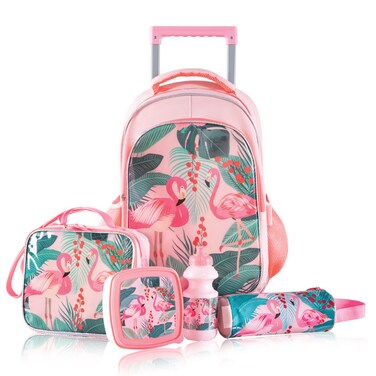 مجموعة Eazy Kids 17 بوصة مكونة من 5 حقيبة مدرسية بعربة مع حقيبة غداء وحقيبة قلم رصاص وصندوق غداء وزجاجة مياه استوائية - وردية
