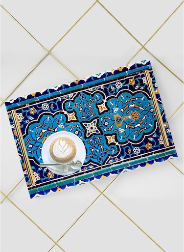 لوحة صينية تقديم مصنوعة من الأكريليك بمقابض معدنية ذهبية اللون مزخرفة بتصميم فسيفساء شرقية ٣٠x٢٠ سم