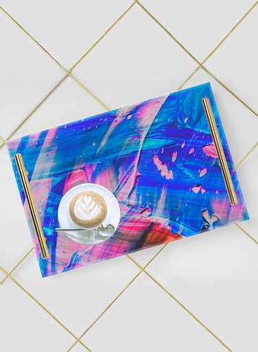 لوحة صينية تقديم مصنوعة من الأكريليك بمقابض معدنية ذهبية اللون مزخرفة بتصميم رسم ألوان زاهية ٣٠x٢٠ سم