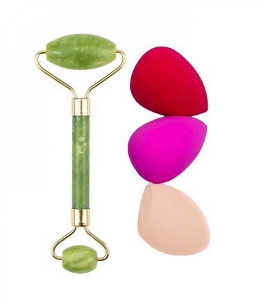 طقم مكون من اسفنجة مكياج 3 قطع ومساج جايد رولر من ريال بيوتي