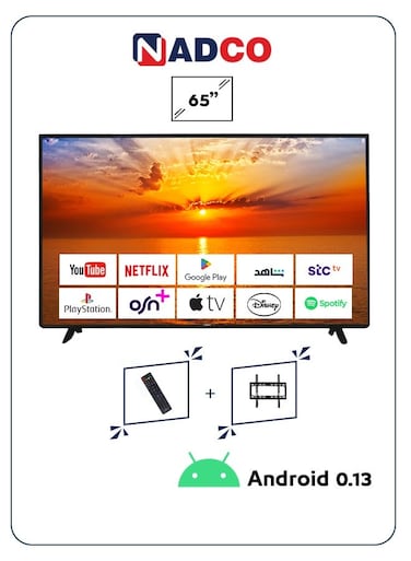 نادكو شاشة ذكية 65 بوصة، أندرويد 0.13، 4 كيه، يو اتش دي مع ريموت كنترول و حامل تلفزيون، NC-65T-4K