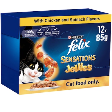 بورينا فيليكس سينسيشنز جيلي بنكهات الدجاج والسبانخ 85 جرام، حزمه من 12
