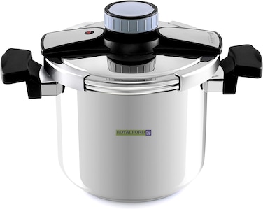 رويال فورد طنجرة ضغط ستانلس ستيل سعة 7 لتر: طنجرة ضغط مصنوعة من مواد عالية الجودة ومتينة مصنوعة من الستانلس ستيل تتميز بعوامل أمان متعددة وفتحة بخار الماء الزائدة، سهلة القفل والفتح، طهي الأطعمة بطريقة صحية في وقت قصير، قاعدة لضمان التوزيع العادل للحرارة، عوامل أمان متعددة سمك القاعدة 5 ملم.
