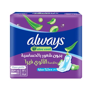 - تتميز فوط أولويز Aloe Cool بتقنية Soft-Dry Topsheet وهي مصممة خصيصًا لتشعري بالنعومة والراحة من دون المساومة على الحماية .