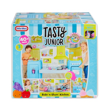 Grow-with-me kitchen begins low for young toddlers, and can be raised for older kids