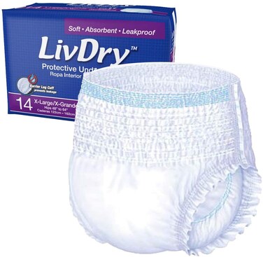 Daytime Soft fabric ADULT PROTECTIVE UNDERWEAR- LivDry offers these daytime protective underwear women and men need when experiencing bladder leaks or loss of control. These super absorbent incontinence products are available in sizes small through XXLarge, and are designed for maximum comfort with ultimate protection in mind. The count of the items per case varies according to the size ordered. INCONTINENCE PRODUCTS- There are times in life that our bodies need a little extra care and consideration. When there is a need for incontinence underwear, you can still live the active life you desire by wearing protection underwear. With age, and after surgery or childbirth, many people experience loss of bladder control. Eliminate leaks with the added convenience of disposable adult underwear. LEAKAGE BARRIER CUFF- We designed these protective underwear for women and men with extra absorbency power, as well as a special leakage barrier cuff with gathered bands to guard against leaks and embarrassing accidents. Cut down on changing extra clothes and washing endless sheets with our LivDry underpants that work just like adult pull ups for both men and women - only better. SUPER ABSORBENT ADULT DIAPERS- LivDry protective underwear for men and women are so absorbent you may not need to use bed pads when you use LivDry urinary incontinence products for women and men. When it's time for disposable underwear, trust these adult underpants for protection and comfort. The super absorbent gel core quickly locks fluid away, helps eliminate odors, and keeps you feeling dry. EXTRA SOFT MATERIAL- The soft, cloth-like, latex-free material features stretch panels that contour to your body for a customized fit. Tear-away sides allow for easy removal, and the colored stitching identifies the front side. We offer three types of adult incontinence relief products: Regular for daytime use, Overnight for longer absorption, and Ultimate for maximum absorption.