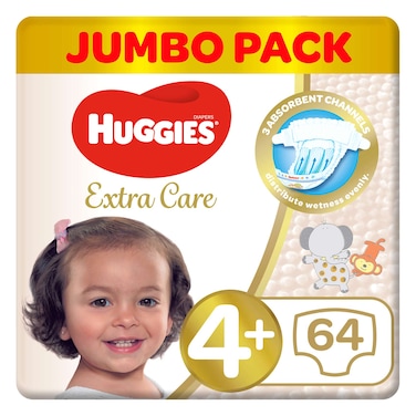 Huggies Extra Care, Size 4+, 10 -16 kg, Jumbo Pack, 64 Diapers