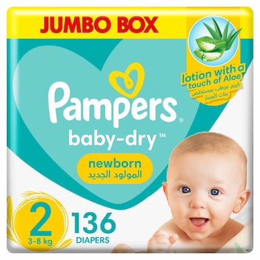 Pampers Aloe Vera Taped Diapers, Size 2, 3-8kg, Jumbo Box, 136 Diapers