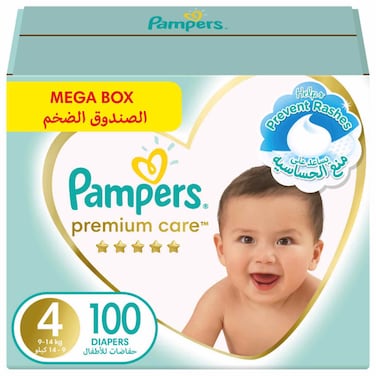 Pampers Premium Care Taped Diapers, Size 4, 9-14 kg, Mega Box, 100 Diapers