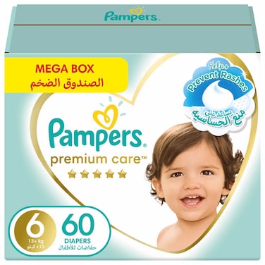 Pampers Premium Care Taped Diapers, Size 6 ,13+kg, Mega Box, 60 Diapers